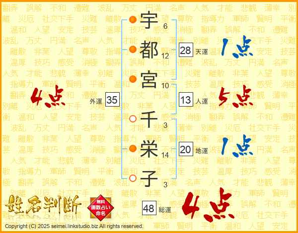 宇(6画)都(12画)宮(10画) 千(3画)栄(14画)子(3画)