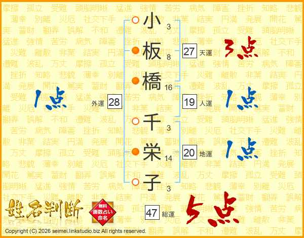 小(3画)板(8画)橋(16画) 千(3画)栄(14画)子(3画)