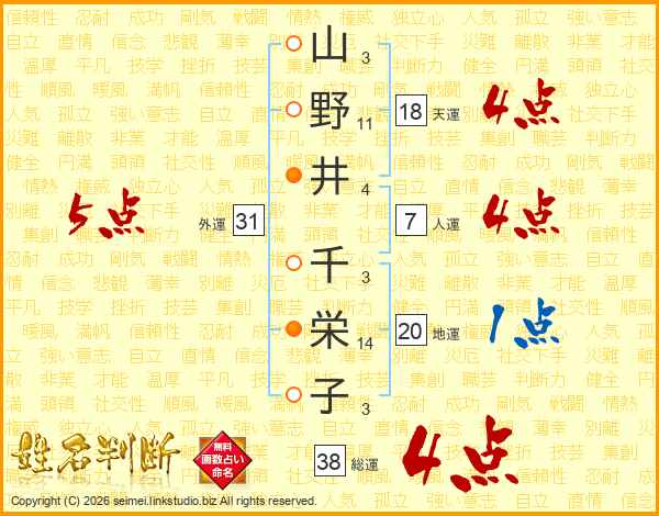 山(3画)野(11画)井(4画) 千(3画)栄(14画)子(3画)