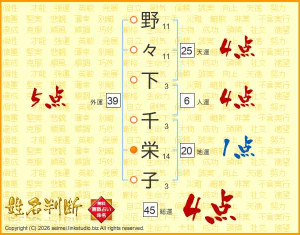 野(11画)々(11画)下(3画) 千(3画)栄(14画)子(3画)