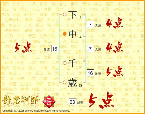 生活面を象徴する運勢です。外部から受ける影響力を表し、結婚運、家庭運や職場、環境への順応性を表します。総運から人運を引いた画数。姓や名が1文字の場合を除く。