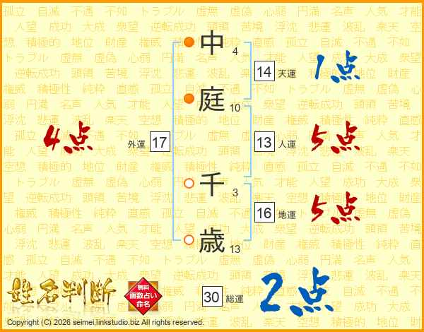 生活面を象徴する運勢です。外部から受ける影響力を表し、結婚運、家庭運や職場、環境への順応性を表します。総運から人運を引いた画数。姓や名が1文字の場合を除く。