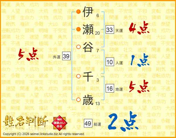 伊(6画)瀬(20画)谷(7画) 千(3画)歳(13画)