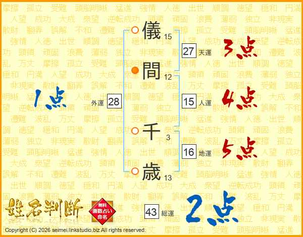 生活面を象徴する運勢です。外部から受ける影響力を表し、結婚運、家庭運や職場、環境への順応性を表します。総運から人運を引いた画数。姓や名が1文字の場合を除く。