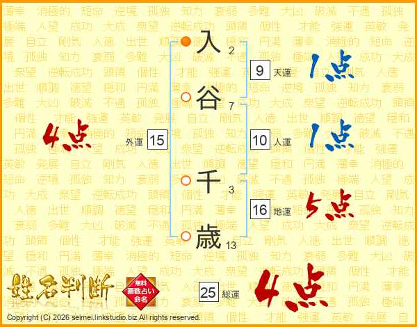 生活面を象徴する運勢です。外部から受ける影響力を表し、結婚運、家庭運や職場、環境への順応性を表します。総運から人運を引いた画数。姓や名が1文字の場合を除く。