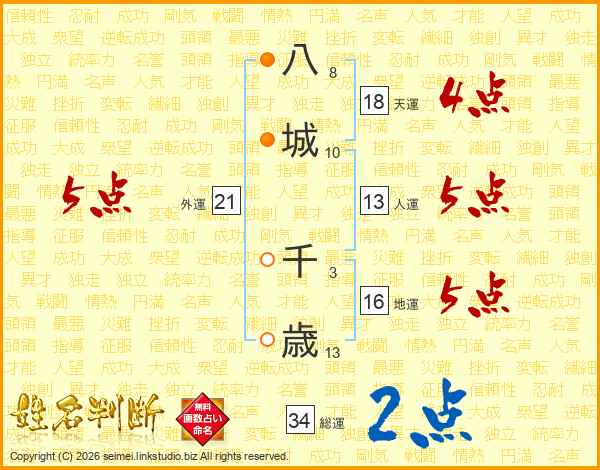 生活面を象徴する運勢です。外部から受ける影響力を表し、結婚運、家庭運や職場、環境への順応性を表します。総運から人運を引いた画数。姓や名が1文字の場合を除く。