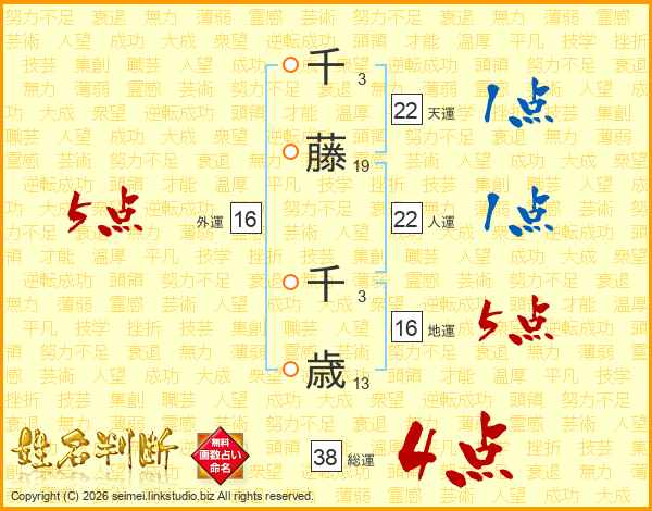 生活面を象徴する運勢です。外部から受ける影響力を表し、結婚運、家庭運や職場、環境への順応性を表します。総運から人運を引いた画数。姓や名が1文字の場合を除く。