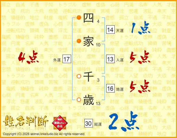 生活面を象徴する運勢です。外部から受ける影響力を表し、結婚運、家庭運や職場、環境への順応性を表します。総運から人運を引いた画数。姓や名が1文字の場合を除く。
