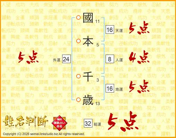 あなたの人生を表す1番重要な運勢です。生涯を通じて影響する総合運となり、主に50歳以降の晩年期に影響を及ぼします。苗字と名前の合計画数。