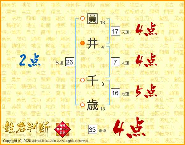 生活面を象徴する運勢です。外部から受ける影響力を表し、結婚運、家庭運や職場、環境への順応性を表します。総運から人運を引いた画数。姓や名が1文字の場合を除く。