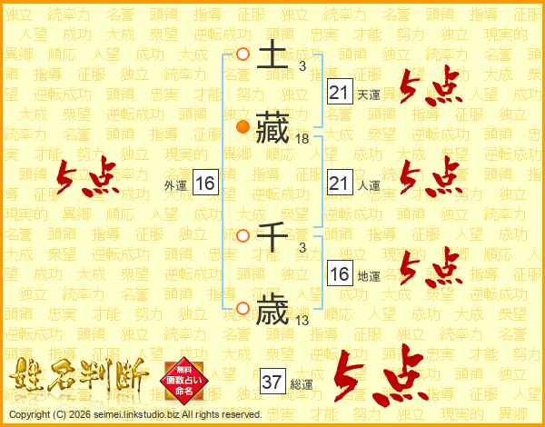生活面を象徴する運勢です。外部から受ける影響力を表し、結婚運、家庭運や職場、環境への順応性を表します。総運から人運を引いた画数。姓や名が1文字の場合を除く。