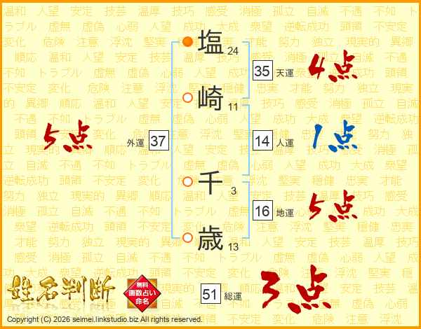 塩崎千歳さんの外運は37画の5点!