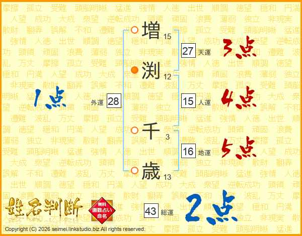 増(15画)渕(12画) 千(3画)歳(13画)