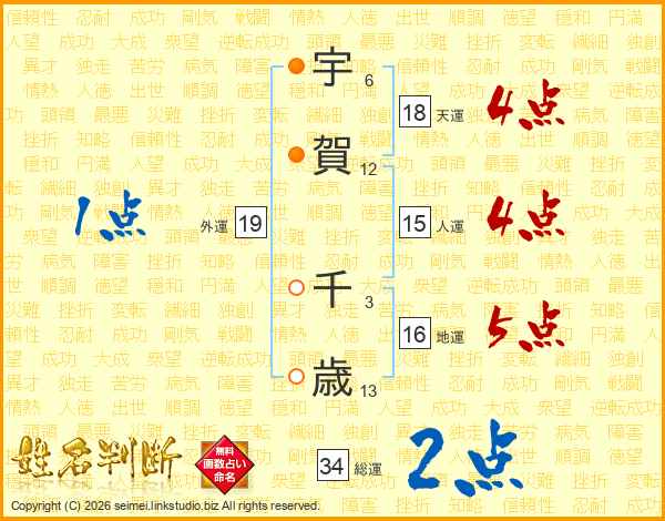 宇賀千歳さんの総運は34画の2点!