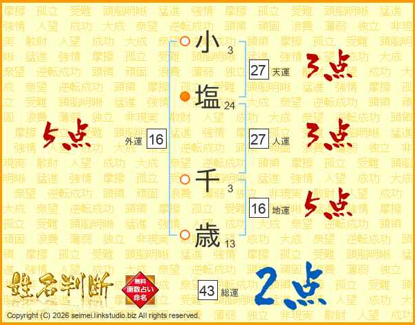 小(3画)塩(24画) 千(3画)歳(13画)