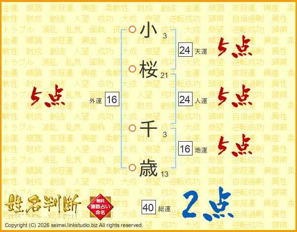 生活面を象徴する運勢です。外部から受ける影響力を表し、結婚運、家庭運や職場、環境への順応性を表します。総運から人運を引いた画数。姓や名が1文字の場合を除く。