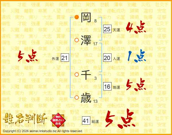 岡(8画)澤(17画) 千(3画)歳(13画)