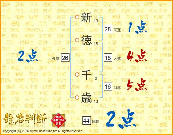 生活面を象徴する運勢です。外部から受ける影響力を表し、結婚運、家庭運や職場、環境への順応性を表します。総運から人運を引いた画数。姓や名が1文字の場合を除く。