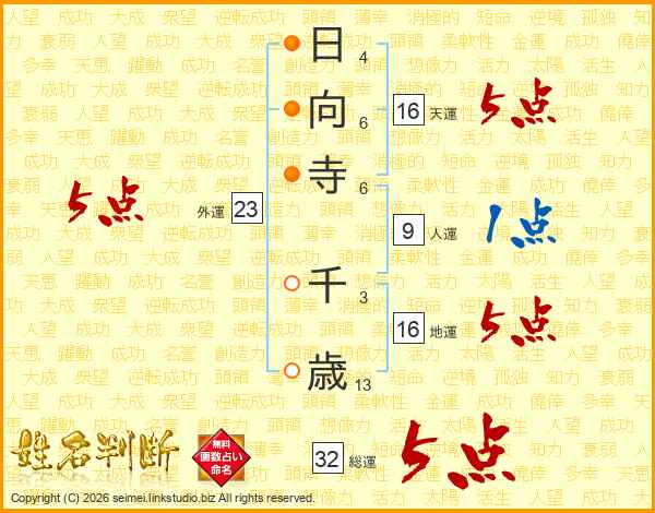 日(4画)向(6画)寺(6画) 千(3画)歳(13画)