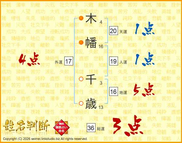 木(4画)幡(16画) 千(3画)歳(13画)