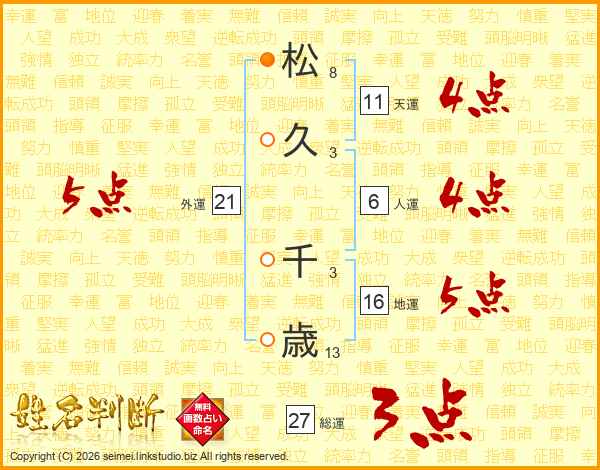 生活面を象徴する運勢です。外部から受ける影響力を表し、結婚運、家庭運や職場、環境への順応性を表します。総運から人運を引いた画数。姓や名が1文字の場合を除く。