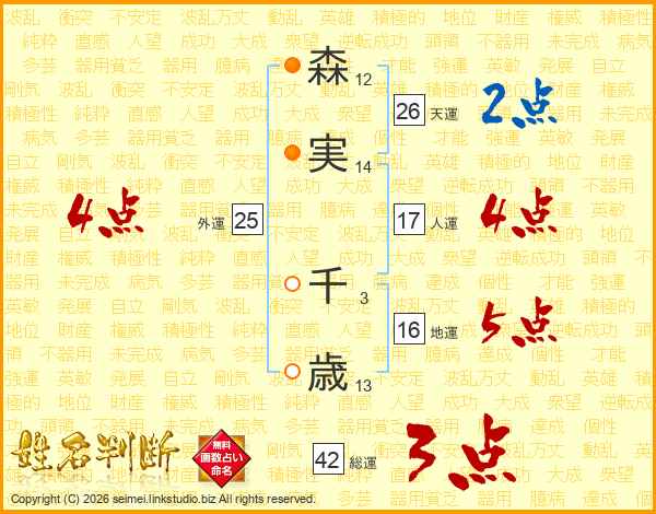 生活面を象徴する運勢です。外部から受ける影響力を表し、結婚運、家庭運や職場、環境への順応性を表します。総運から人運を引いた画数。姓や名が1文字の場合を除く。