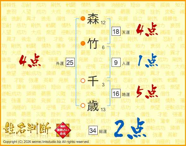 あなたの人生を表す1番重要な運勢です。生涯を通じて影響する総合運となり、主に50歳以降の晩年期に影響を及ぼします。苗字と名前の合計画数。