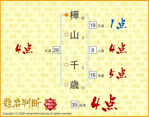生活面を象徴する運勢です。外部から受ける影響力を表し、結婚運、家庭運や職場、環境への順応性を表します。総運から人運を引いた画数。姓や名が1文字の場合を除く。
