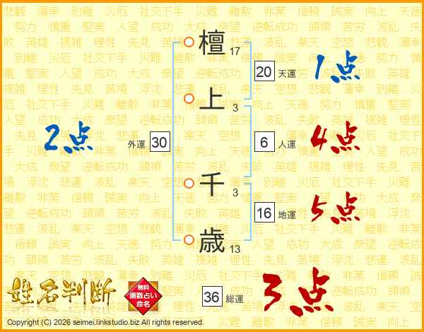 生活面を象徴する運勢です。外部から受ける影響力を表し、結婚運、家庭運や職場、環境への順応性を表します。総運から人運を引いた画数。姓や名が1文字の場合を除く。