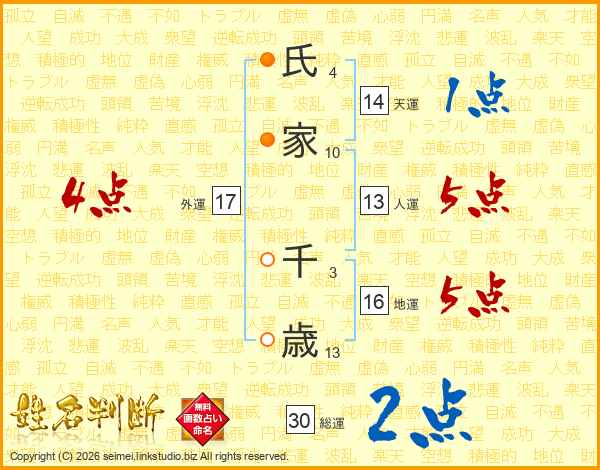 氏(4画)家(10画) 千(3画)歳(13画)