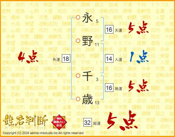 永野千歳さんの総運は32画の5点!