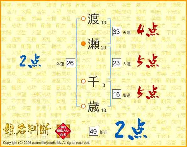 渡(13画)瀬(20画) 千(3画)歳(13画)