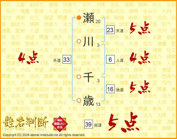 瀬(20画)川(3画) 千(3画)歳(13画)