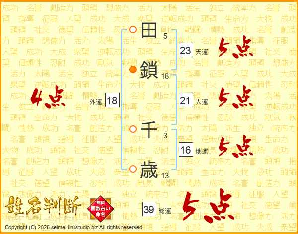 田(5画)鎖(18画) 千(3画)歳(13画)