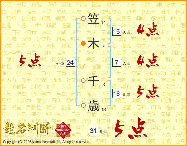 笠(11画)木(4画) 千(3画)歳(13画)