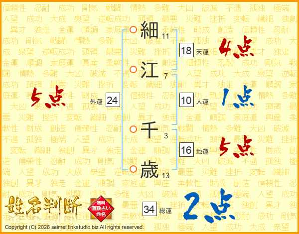 細江千歳さんの総運は34画の2点!