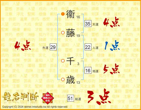衞(16画)藤(19画) 千(3画)歳(13画)