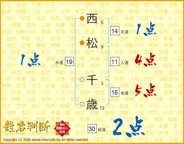生活面を象徴する運勢です。外部から受ける影響力を表し、結婚運、家庭運や職場、環境への順応性を表します。総運から人運を引いた画数。姓や名が1文字の場合を除く。