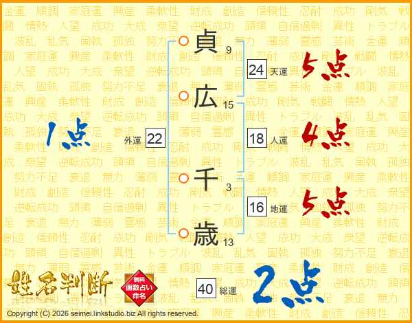 生活面を象徴する運勢です。外部から受ける影響力を表し、結婚運、家庭運や職場、環境への順応性を表します。総運から人運を引いた画数。姓や名が1文字の場合を除く。