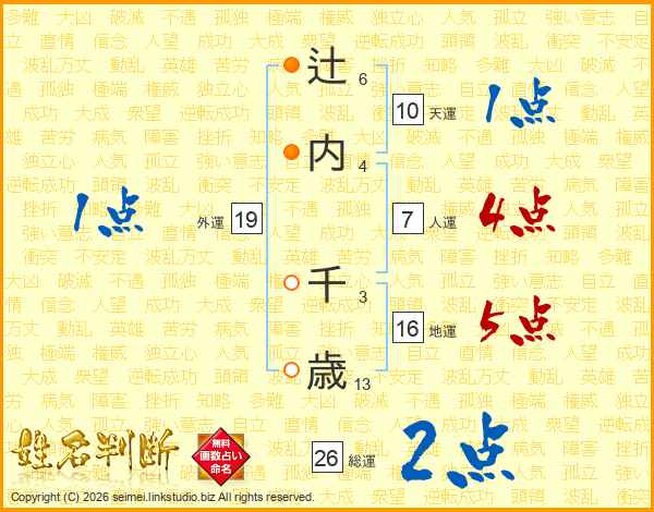 生活面を象徴する運勢です。外部から受ける影響力を表し、結婚運、家庭運や職場、環境への順応性を表します。総運から人運を引いた画数。姓や名が1文字の場合を除く。