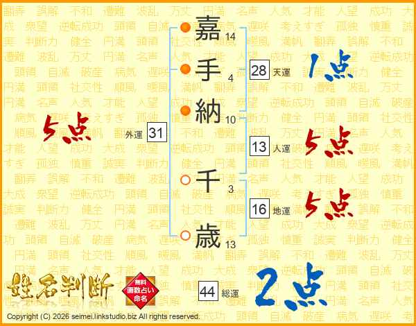 嘉(14画)手(4画)納(10画) 千(3画)歳(13画)