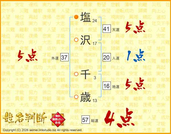 塩(24画)沢(17画) 千(3画)歳(13画)