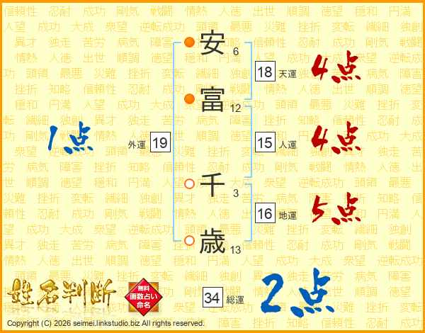 安(6画)富(12画) 千(3画)歳(13画)