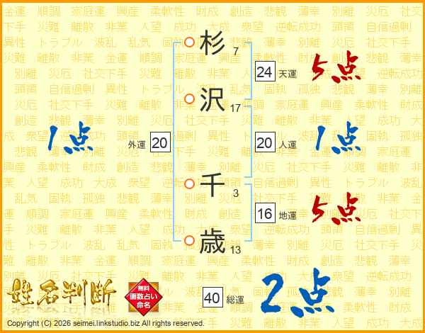 杉(7画)沢(17画) 千(3画)歳(13画)