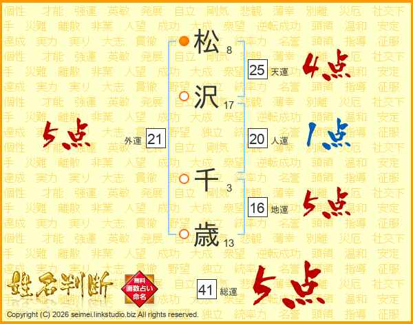 生活面を象徴する運勢です。外部から受ける影響力を表し、結婚運、家庭運や職場、環境への順応性を表します。総運から人運を引いた画数。姓や名が1文字の場合を除く。