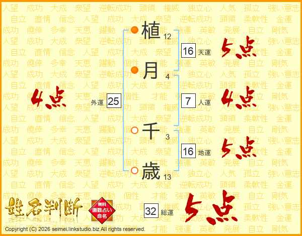 植月千歳さんの総運は32画の5点!