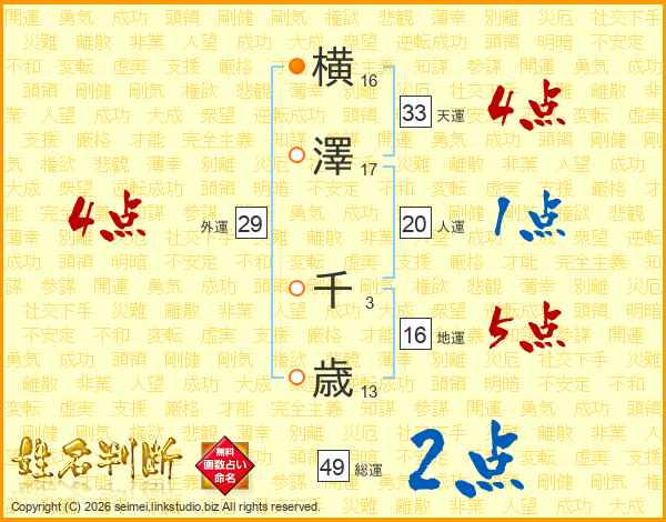 生活面を象徴する運勢です。外部から受ける影響力を表し、結婚運、家庭運や職場、環境への順応性を表します。総運から人運を引いた画数。姓や名が1文字の場合を除く。