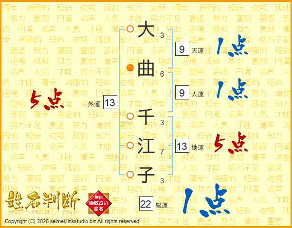 大曲千江子さんの総運は22画の1点!
