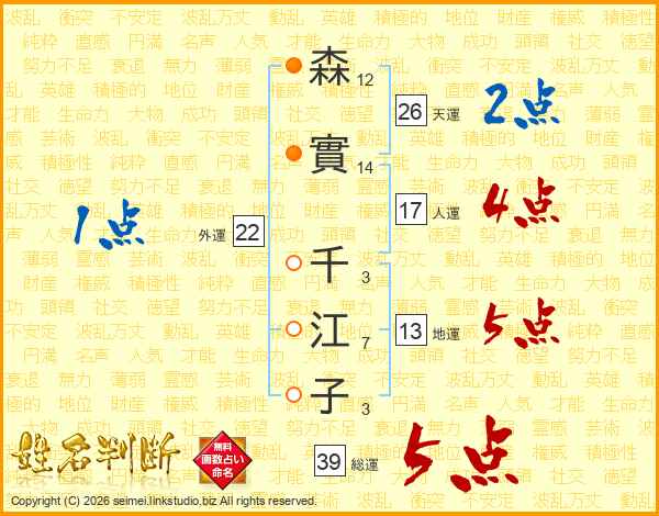 森(12画)實(14画) 千(3画)江(7画)子(3画)