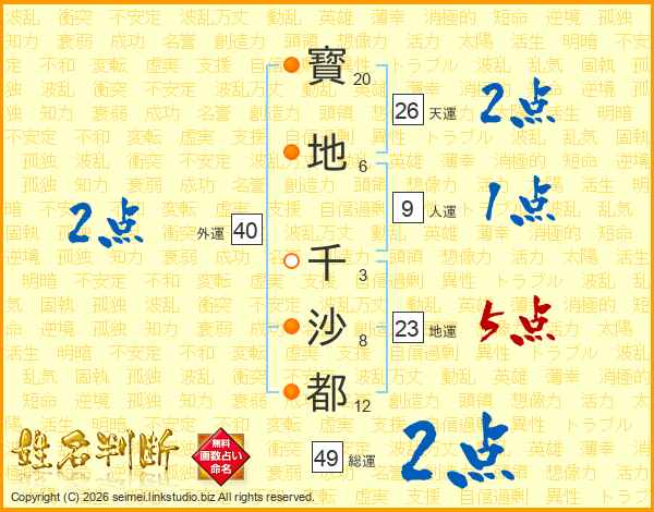 寳(20画)地(6画) 千(3画)沙(8画)都(12画)